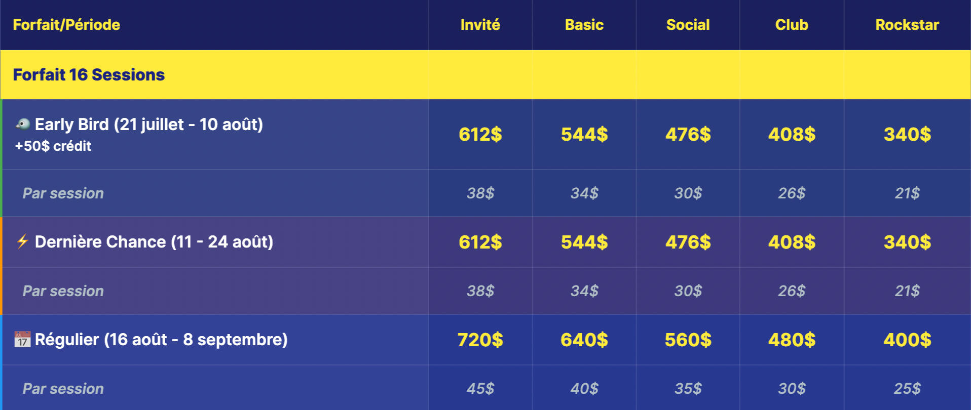| 16 semaines : Rabais de 15 % + Crédit club de 50 $ | 16 semaines : Rabais de 15 % | À partir de 544 $ |