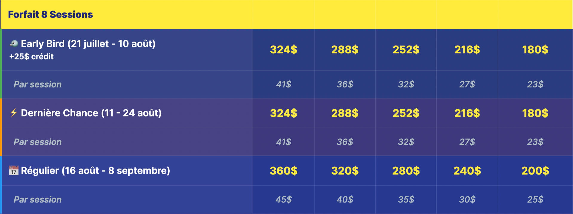 | 8 semaines : Rabais de 10 % + Crédit club de 25 $ | 8 semaines : Rabais de 10 % | À partir de 324 $ |